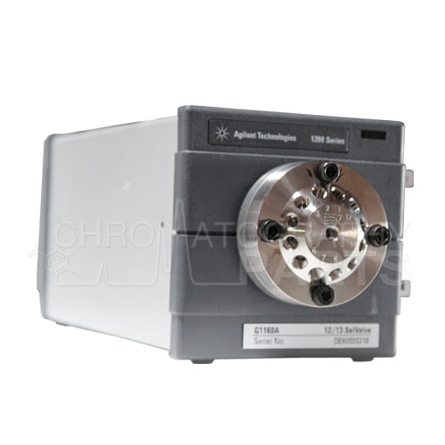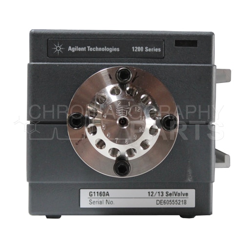 The G1160A Agilent 1100 Series Multiple Purpose Switching Valve is a stainless steel 12-position, 13-port motorized valve operated by a microprocessor and controlled via CAN interface for the seamless integration to the 1100 Series system. Initially intended for the operation of multiple fraction collectors in parallel (up to 3), it directs the liquid flow from 1 inlet port to 12 different outlet ports or from 12 different inlet ports to 1 outlet.1