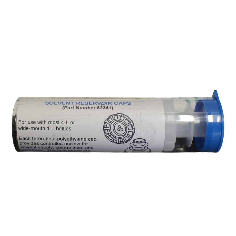 The Waters Corporation Solvent Reservoir Caps are polyethylene caps designed for HPLC solvent bottles, specifically featuring a three-hole design to accommodate helium inlet, exhaust, and solvent lines. This 4-pack of caps fits 1.25-inch neck openings, common on standard 4L brown acetonitrile (ACN) bottles and “large mouth” 1L bottles. 4L 4/pkg PN: WAT062341