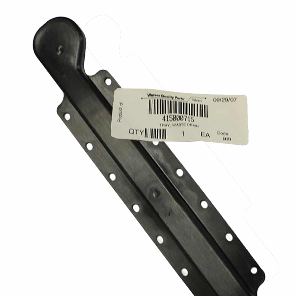 The Waters Waste DrainTray is a black plastic, laboratory-grade component, used within chromatography systems to collect and manage waste runoff. PN: 415000715.